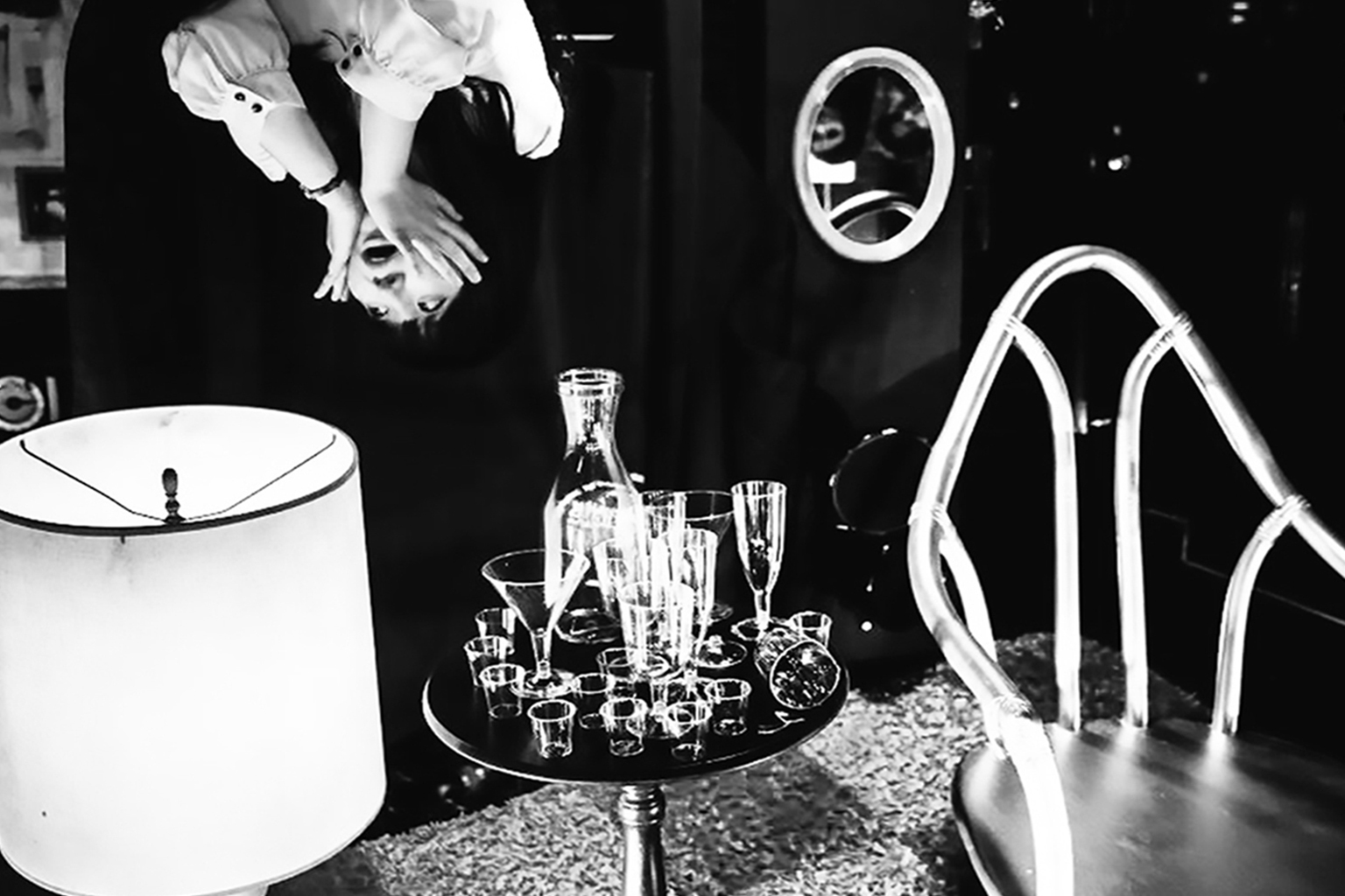 A set was builded upside-down in order to deceive the spectator's point of view and give to the photographer the chance to use the set as a backdrop to invite the guests into it. Once the shot has been taken, rotate the camera and get the effect upside down.