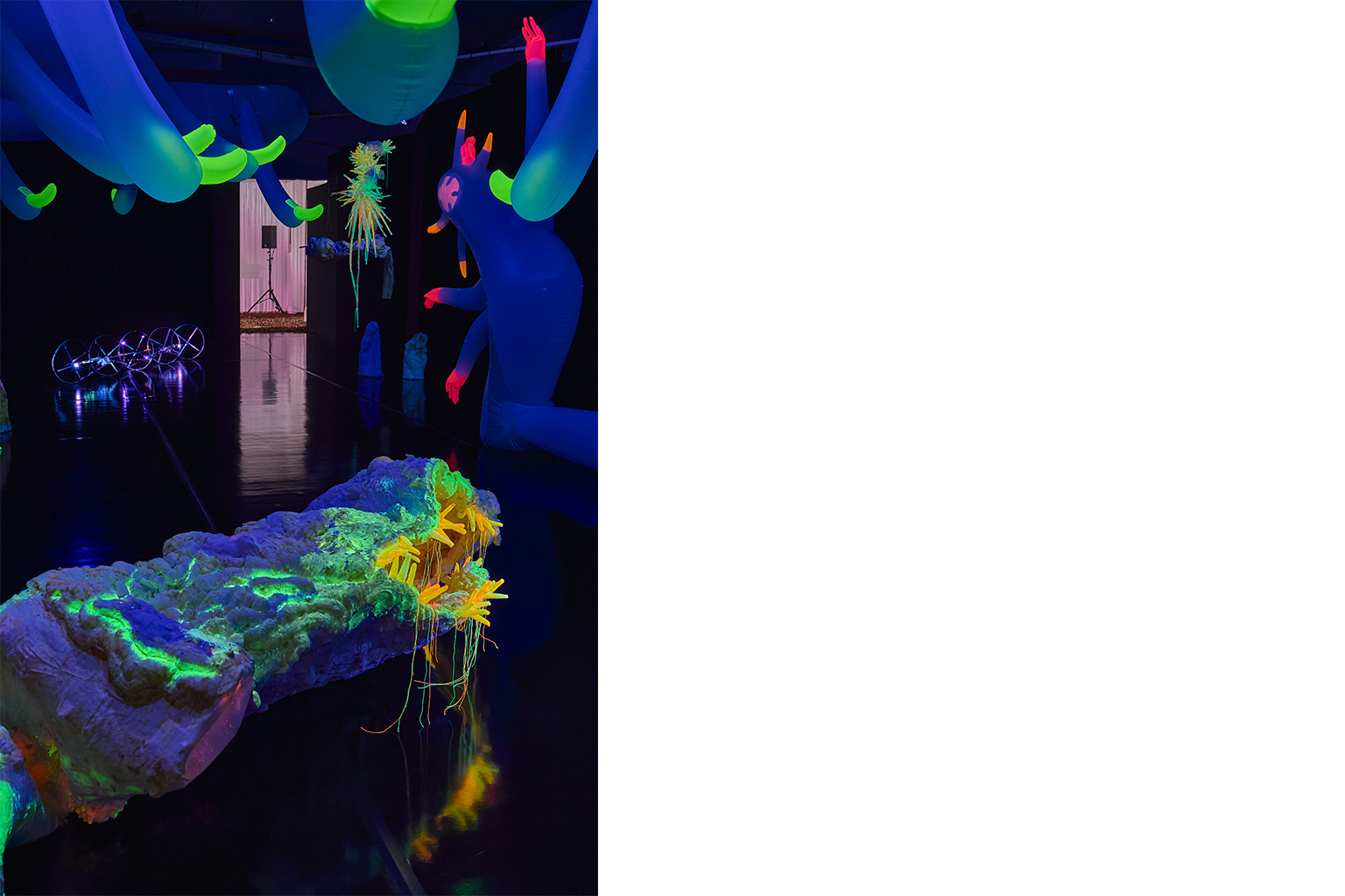 The tunnel leads directly into the second room, where the viewers are catapulted into the worm's inner belly, with all of Anne's abstract and fluorescent sculptures representing the inner world.