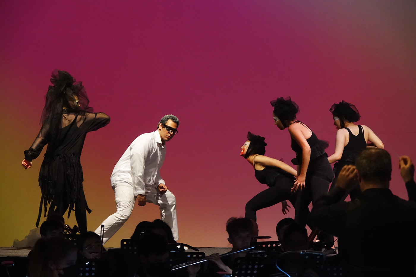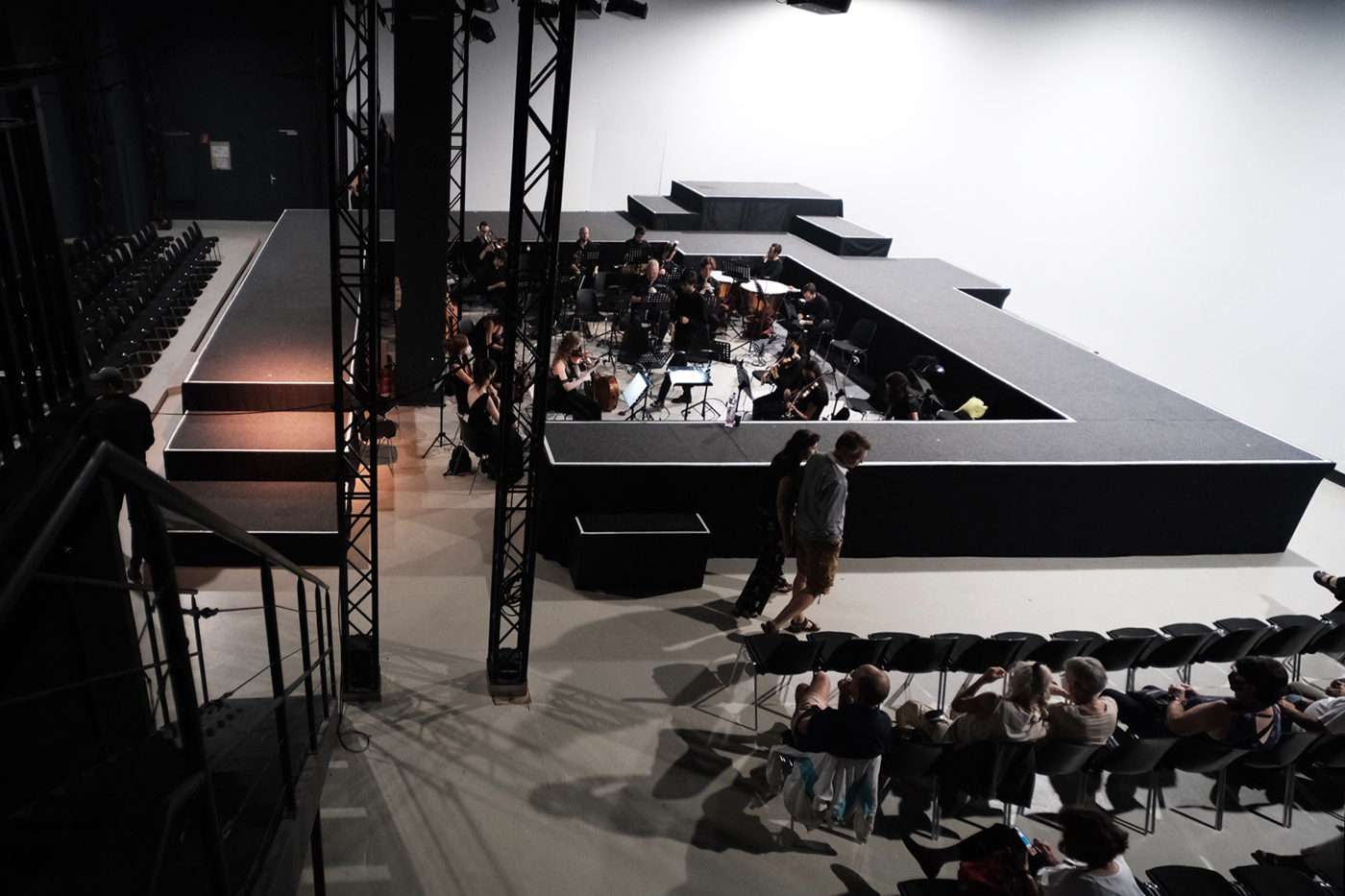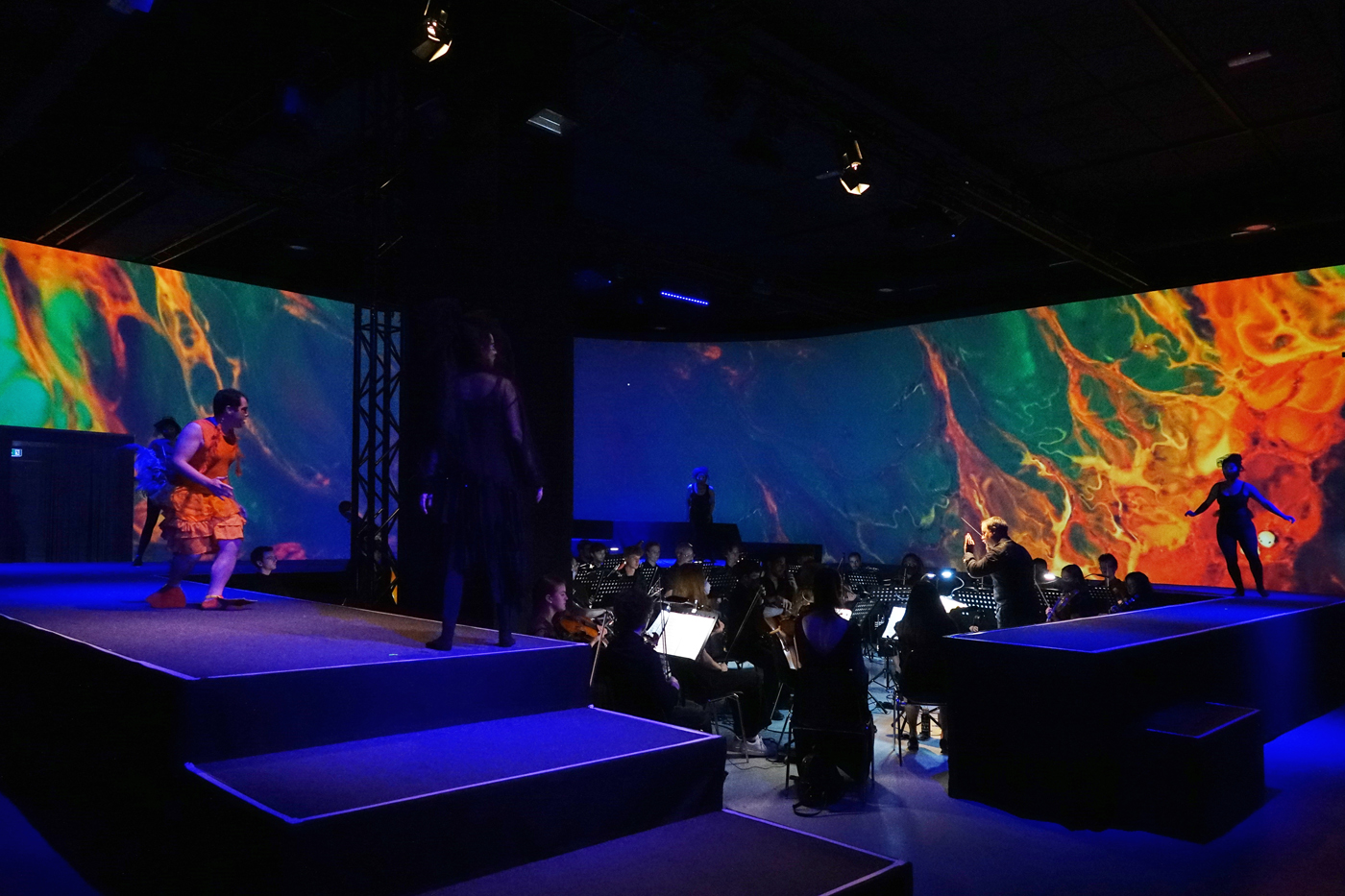 An unusual stage design for Die Zauberflöte,, where the performers are immersed in an imaginative dreamlike backdrop, running on a square-shaped catwalk, like a fashion show while singing close to the audience. A central stage layout was designed to meet several challenges and maximise the space normally used as an event venue, with a 180-degree panoramic screen and concrete walls. Using 90cm raised platform solution, the orchestra is positioned in the centre, in the pit, to enhance optimal sound bounce for the singers as well to surround the both sides audience. With this 12x12m square-shaped configuration, the audience are located on the two sides of the stage, thus optimally facing the panoramic screen and enjoying the actors immersed in 180-degree canvas storytelling, as if subjects of an abstract painting. Following Mozart's music and diving into this dreamlike, surreal, masonic world, full of controversy, comes the choice of using colour gradients and pastel tones as video projections. Almost closing their eyes and letting themselves be carried away by the music, the spectators start from the overture on an abstract journey with a multitude of meanings.
