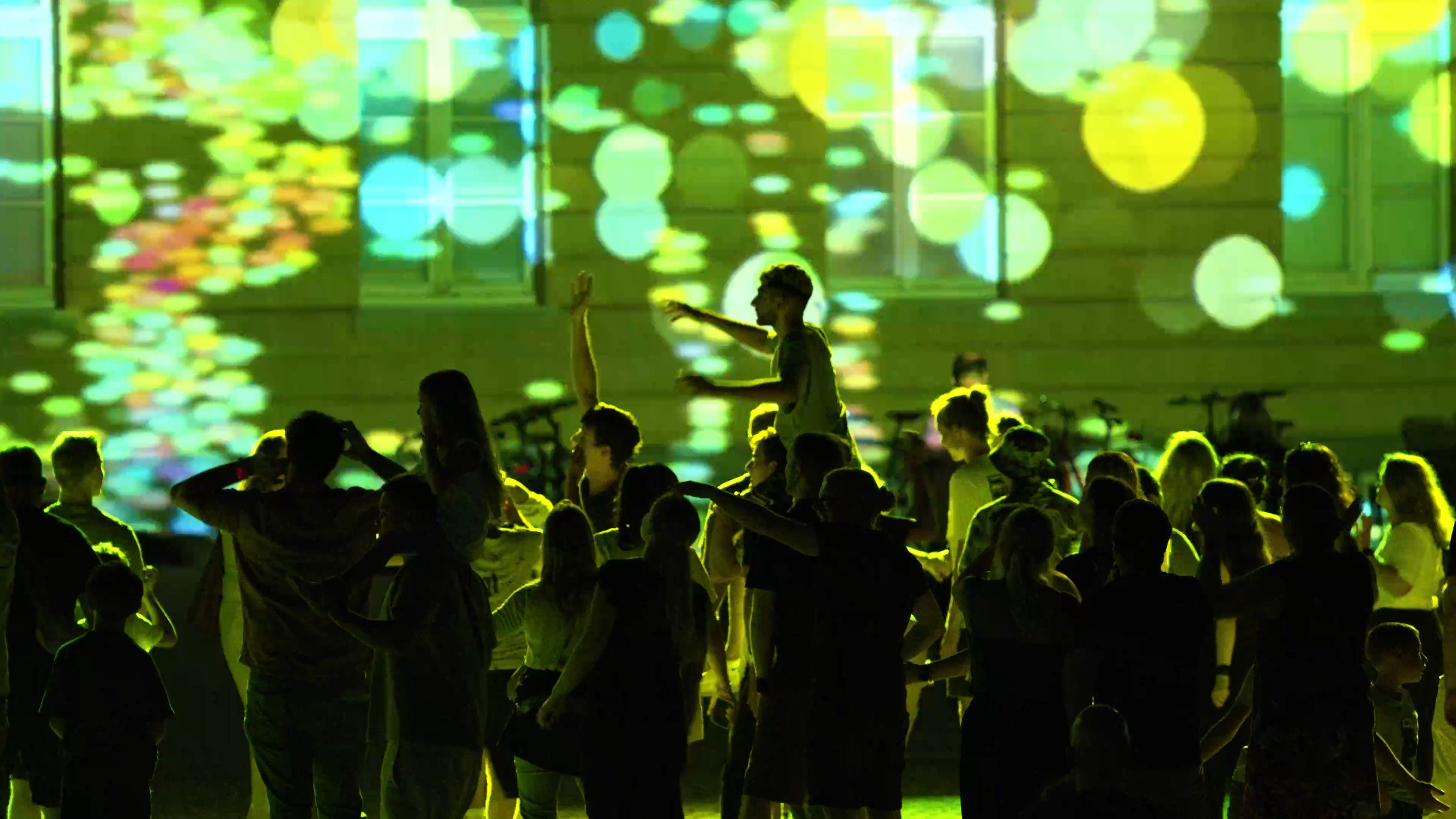 The action space is emphasised by a colourful light design, the more the audience interacts with the façade the more the installation comes to life, the more the audience dances the more the castle façade is coloured.