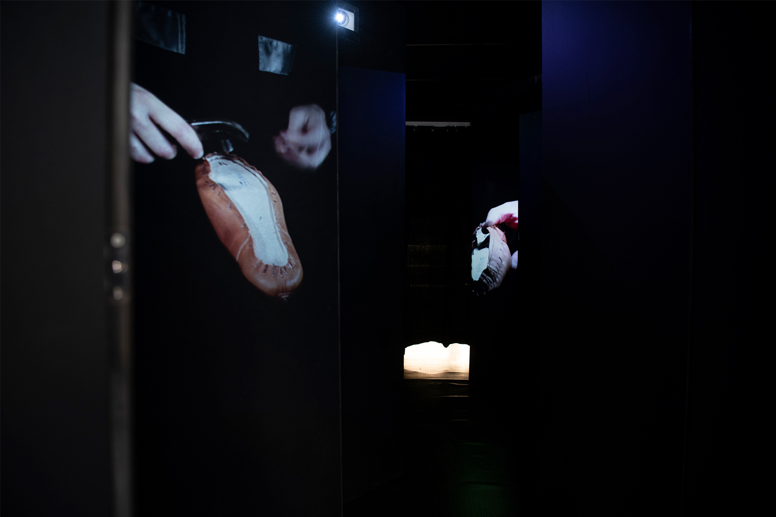 Customers are invited to pass through the narrow entrance corridor leading to the showroom, on the path, with a jagged design, N.6 video projections real size are displaying the shoemaking process.