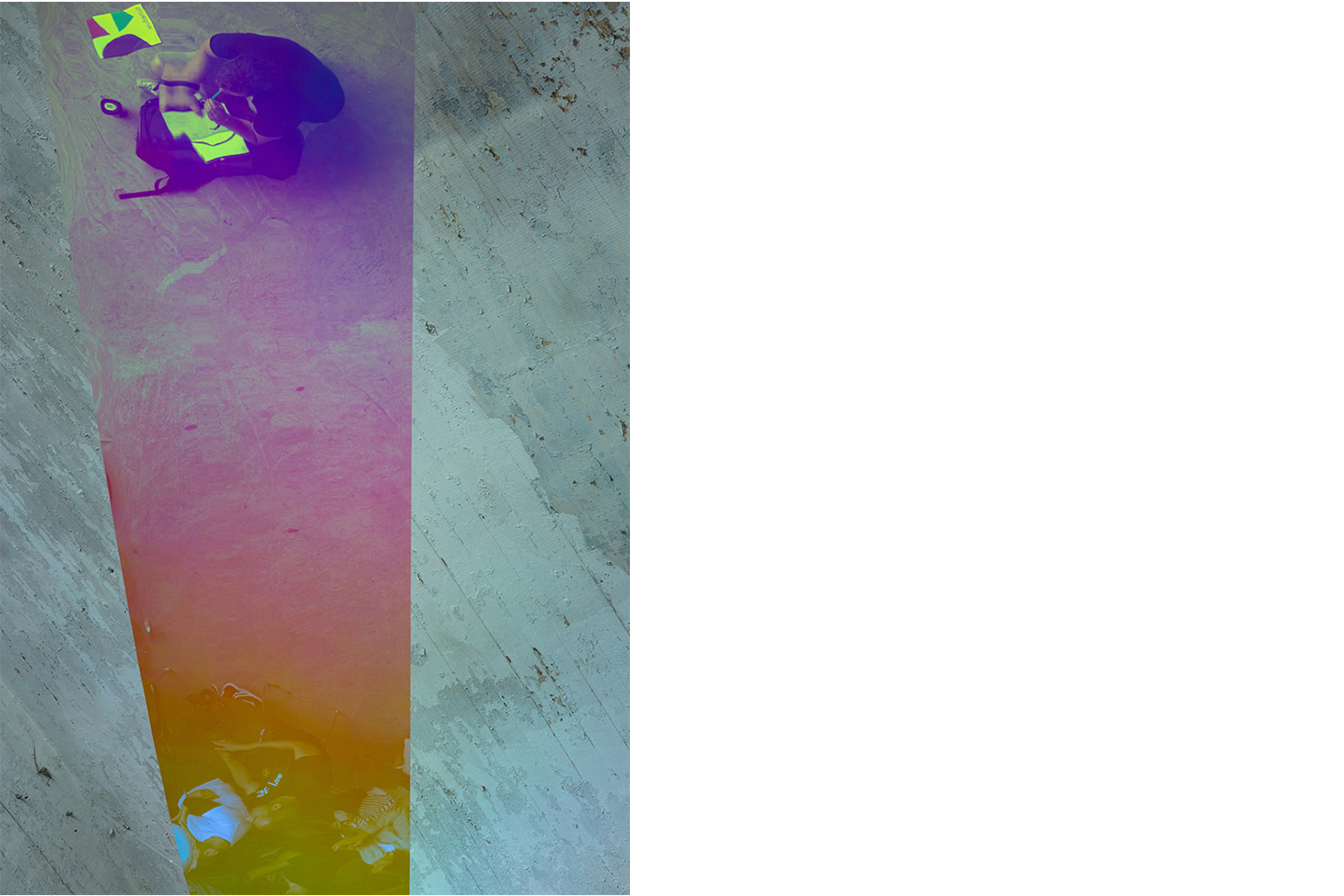 Embracing the two-story venue, the installation separates daylight into prismatic colours through nano and microlayer technology and irradiates viewers with magma and sunset sky reflections