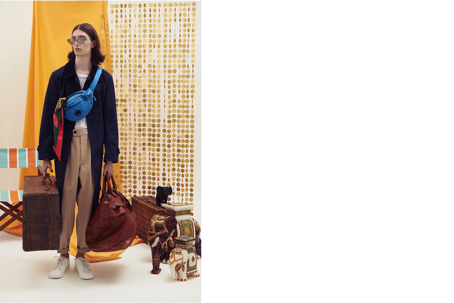 Textiles and different props are used in a block of colors and recreate an atmosphere suspended between dream and travel, where a traditional middle eastern market blends with a desert tent, a tennis field or a luxurious backdrop.