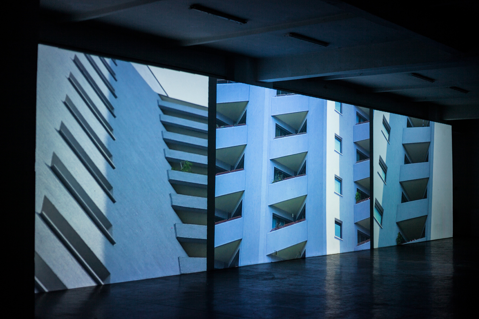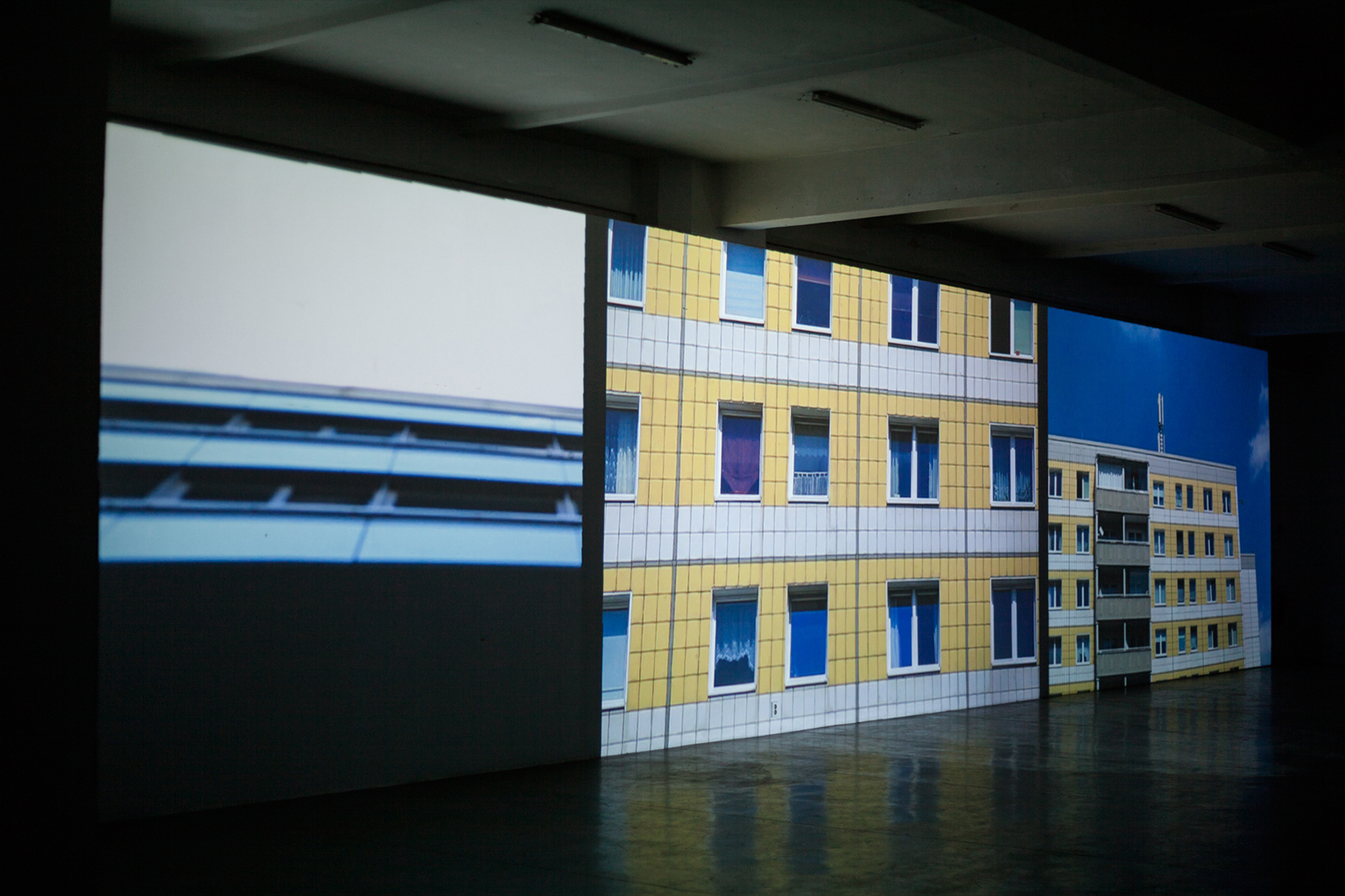 The audience will face a large projected surface created by multi-projection which will work as a visual canvas for filmed sequences, both as one, big, panorama screen, cinemascope ratio or splitting screens into more panels. Therefore, viewers are subjected to an interplay between image, sound, and spatial structures, become part of a figuration that necessarily remains broken and asynchronous.