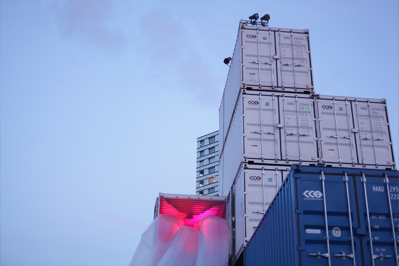 For this festival, named Shine, Wave of Tomorrow asked Hilberink Bosch architects to design an exciting temporal structure that functions as a central point for the terrain and can house different media an art installations. Twenty standard 20 ft containers rise up from the heart of the festival ground, they are creatively piled up in four slabs which guarantees for an interesting inside and outside structure. Sixteen white containers of the Twilight Tower, as it is called by the organisation, will serve as screen for an architectural videomapping by 1024 Architecture. The tower is also the home for the inflatable sculptures by Plastique Fantastique, the Visionair installation by Eliane Esther Bots and some video- and gaming spaces. The tower functioned as landmark, interactive silhouette and as an extraordinary space during the Shine festival.